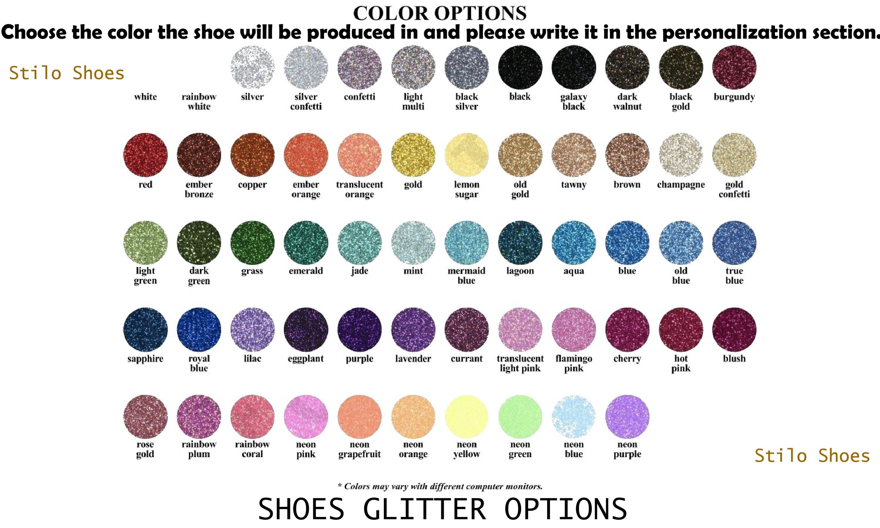 At StiloShoes, we offer free customization for your shoes, including the addition of your name and date. We do not dye shoes in colors other than white; instead, we produce them using colored materials with original inventory colors. Our handcrafted shoes feature special touches, such as glitter and printed writing on some styles, while others incorporate these customizations onto the shoe laces. All customizations are free; simply add your preferences in the personalization section. The jewelry letters and numbers can be easily removed from the shoes. For any personalizations or changes to your order, we are eager to assist and design together with you. We kindly ask that you read the product description before placing your order.