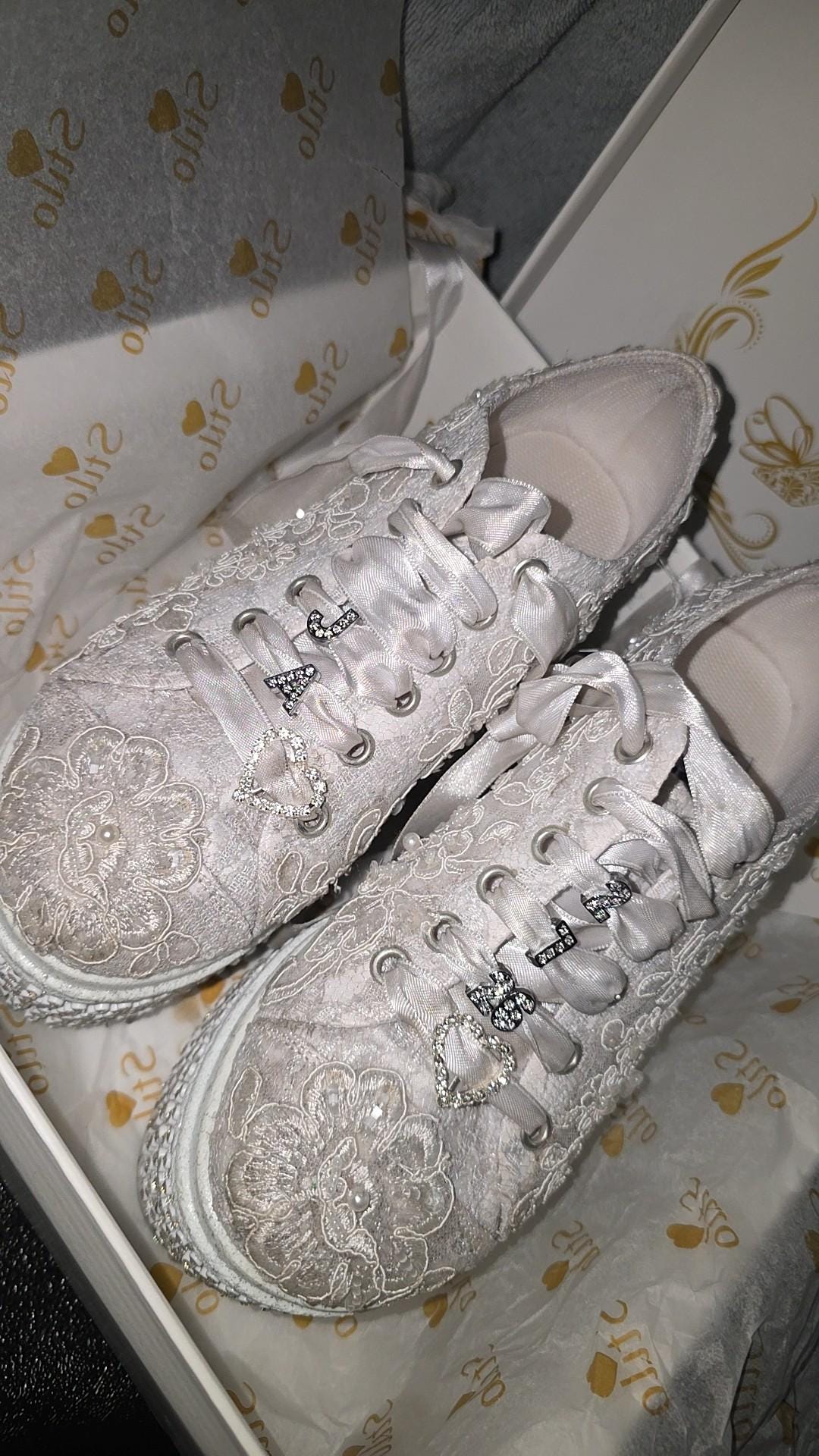 At StiloShoes, we offer free customization for your shoes, including the addition of your name and date. We do not dye shoes in colors other than white; instead, we produce them using colored materials with original inventory colors. Our handcrafted shoes feature special touches, such as glitter and printed writing on some styles, while others incorporate these customizations onto the shoe laces. All customizations are free; simply add your preferences in the personalization section. The jewelry letters and numbers can be easily removed from the shoes. For any personalizations or changes to your order, we are eager to assist and design together with you. We kindly ask that you read the product description before placing your order.
