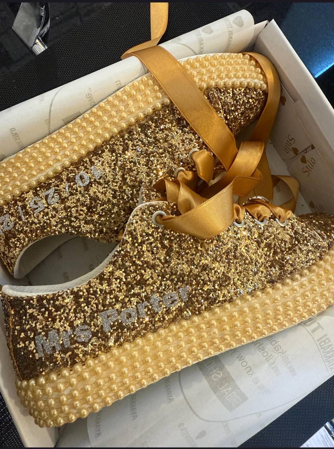 At StiloShoes, we offer free customization for your shoes, including the addition of your name and date. We do not dye shoes in colors other than white; instead, we produce them using colored materials with original inventory colors. Our handcrafted shoes feature special touches, such as glitter and printed writing on some styles, while others incorporate these customizations onto the shoe laces. All customizations are free; simply add your preferences in the personalization section. The jewelry letters and numbers can be easily removed from the shoes. For any personalizations or changes to your order, we are eager to assist and design together with you. We kindly ask that you read the product description before placing your order.