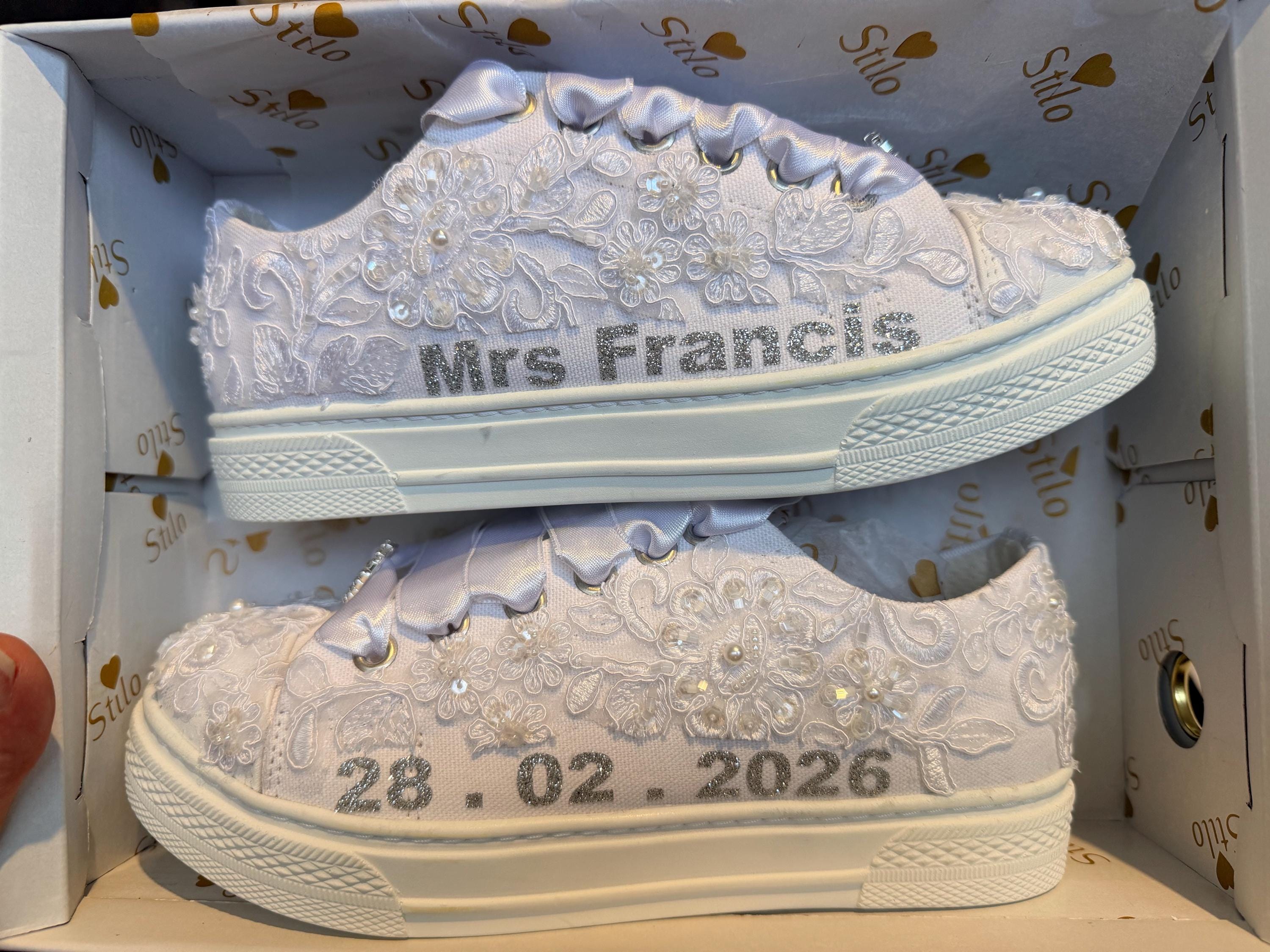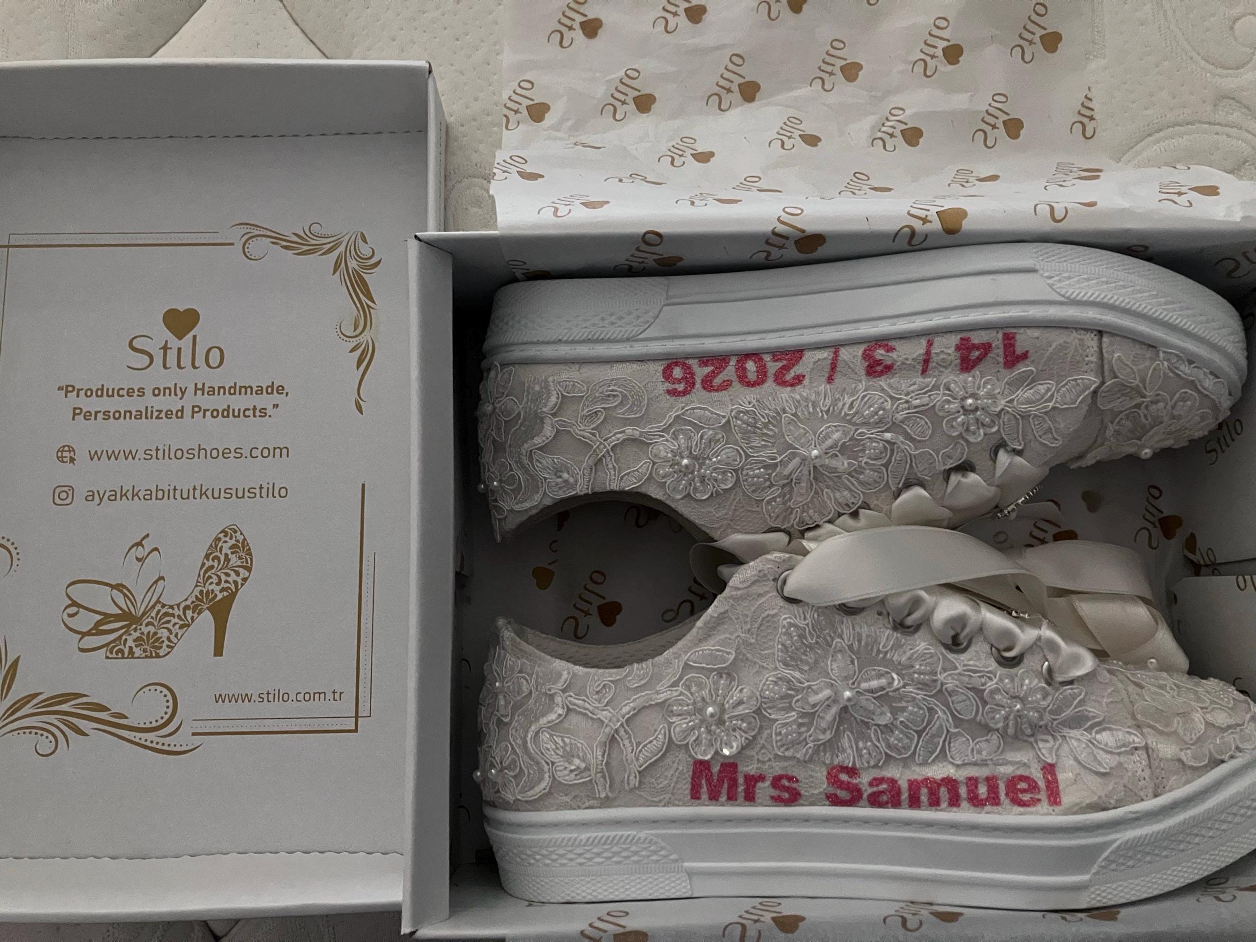 At StiloShoes, we offer free customization for your shoes, including the addition of your name and date. We do not dye shoes in colors other than white; instead, we produce them using colored materials with original inventory colors. Our handcrafted shoes feature special touches, such as glitter and printed writing on some styles, while others incorporate these customizations onto the shoe laces. All customizations are free; simply add your preferences in the personalization section. The jewelry letters and numbers can be easily removed from the shoes. For any personalizations or changes to your order, we are eager to assist and design together with you. We kindly ask that you read the product description before placing your order.