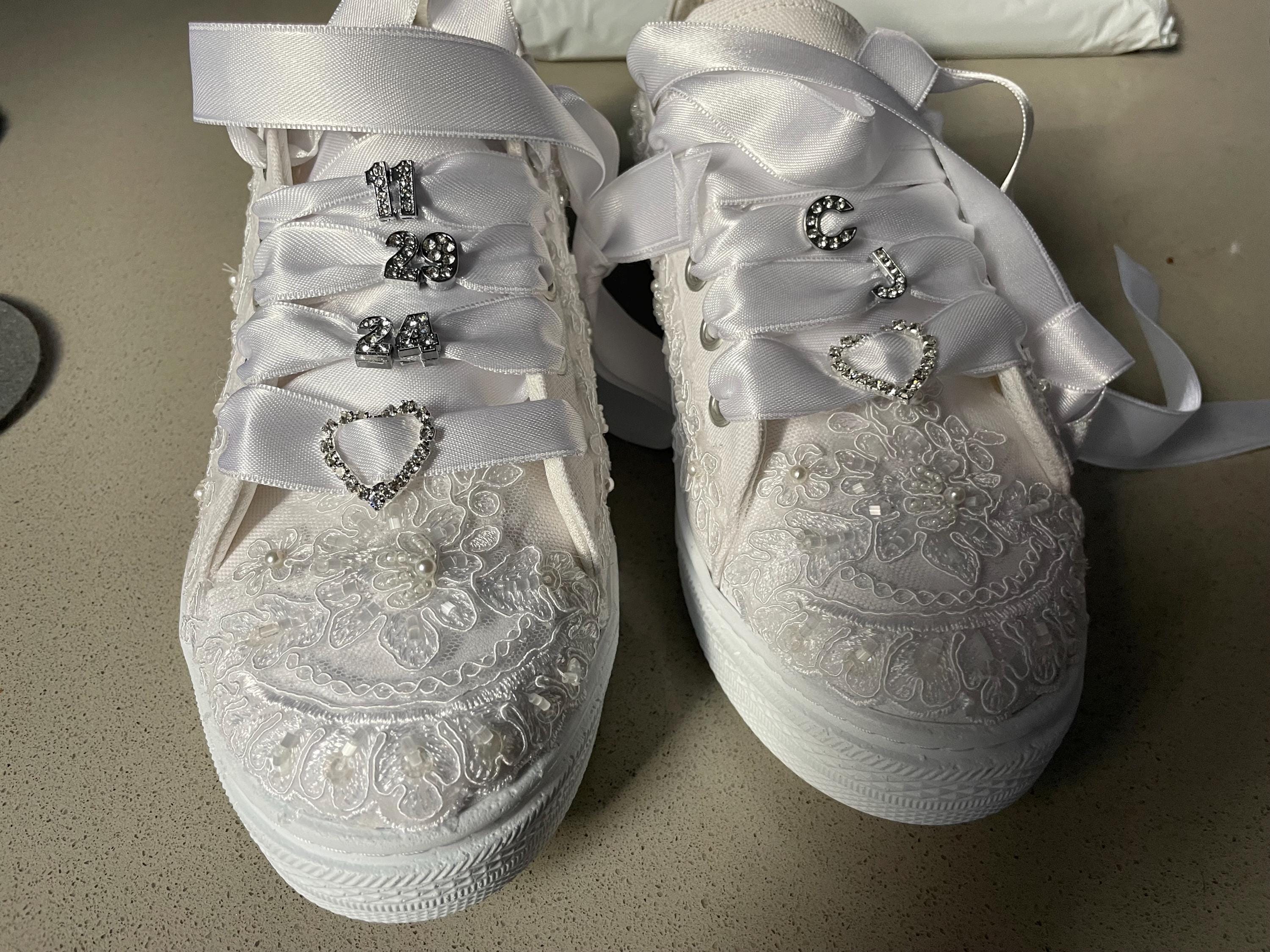 At StiloShoes, we offer free customization for your shoes, including the addition of your name and date. We do not dye shoes in colors other than white; instead, we produce them using colored materials with original inventory colors. Our handcrafted shoes feature special touches, such as glitter and printed writing on some styles, while others incorporate these customizations onto the shoe laces. All customizations are free; simply add your preferences in the personalization section. The jewelry letters and numbers can be easily removed from the shoes. For any personalizations or changes to your order, we are eager to assist and design together with you. We kindly ask that you read the product description before placing your order.