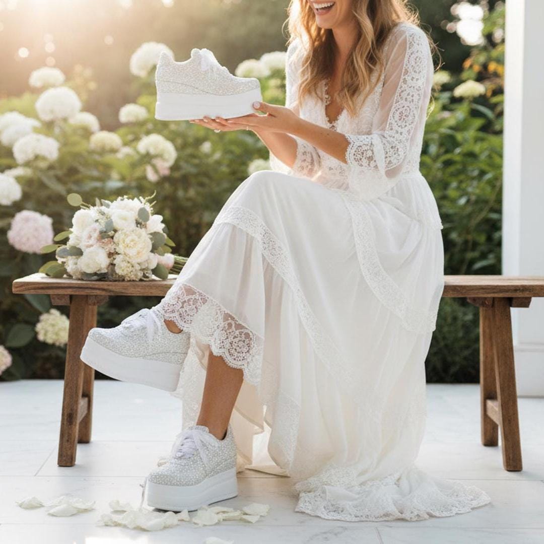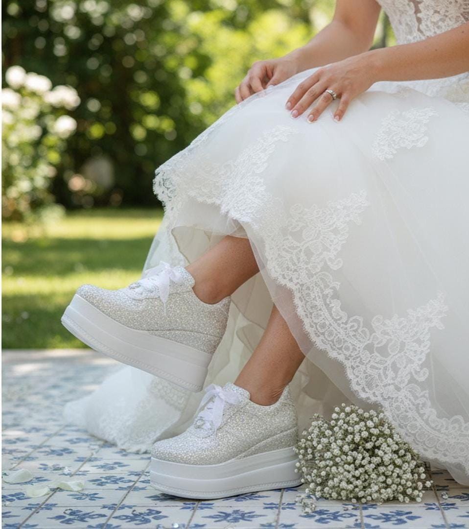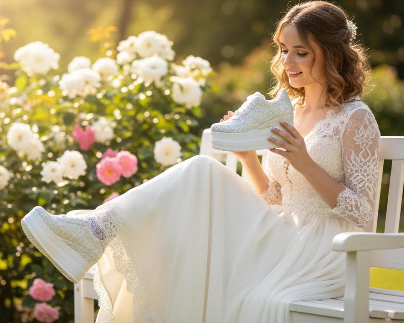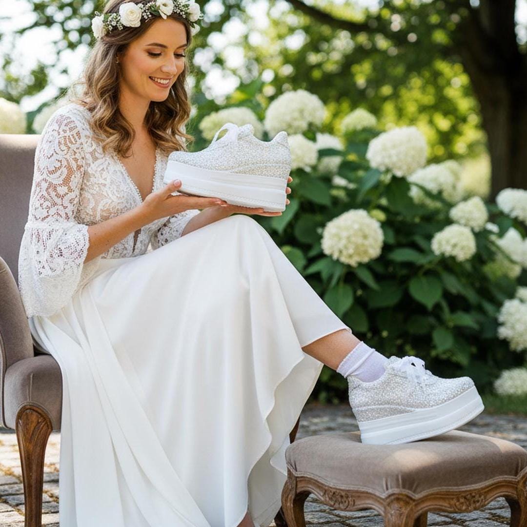 At StiloShoes, we offer free customization for your shoes, including the addition of your name and date. We do not dye shoes in colors other than white; instead, we produce them using colored materials with original inventory colors. Our handcrafted shoes feature special touches, such as glitter and printed writing on some styles, while others incorporate these customizations onto the shoe laces. All customizations are free; simply add your preferences in the personalization section. The jewelry letters and numbers can be easily removed from the shoes. For any personalizations or changes to your order, we are eager to assist and design together with you. We kindly ask that you read the product description before placing your order.