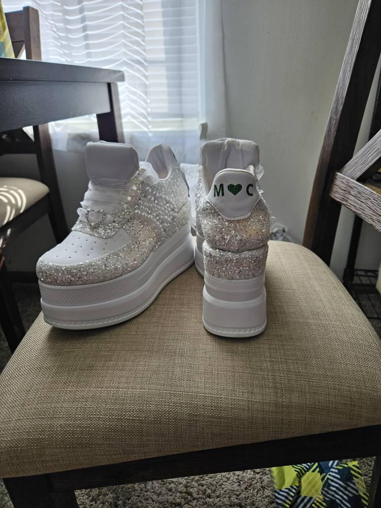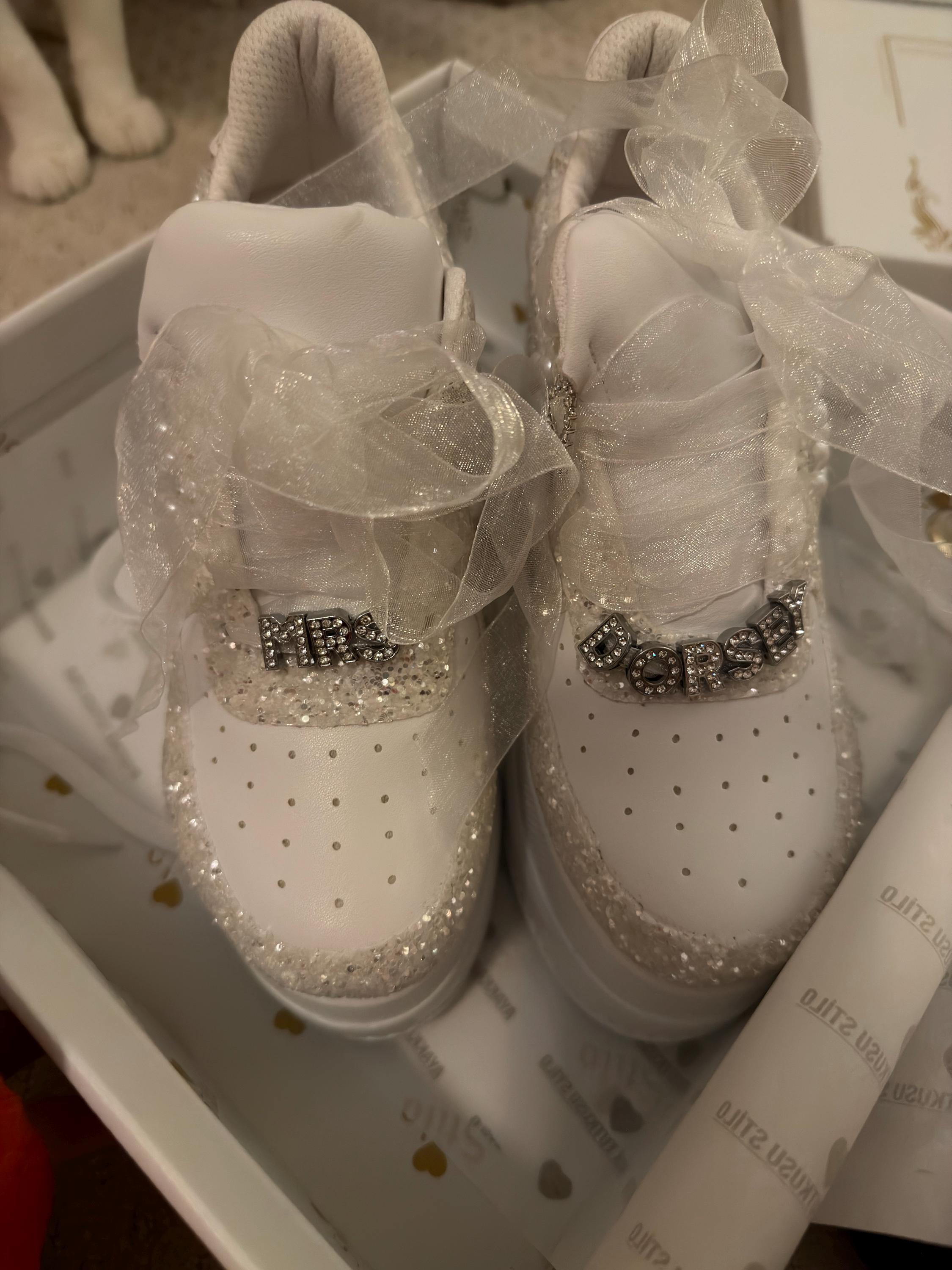 At StiloShoes, we offer free customization for your shoes, including the addition of your name and date. We do not dye shoes in colors other than white; instead, we produce them using colored materials with original inventory colors. Our handcrafted shoes feature special touches, such as glitter and printed writing on some styles, while others incorporate these customizations onto the shoe laces. All customizations are free; simply add your preferences in the personalization section. The jewelry letters and numbers can be easily removed from the shoes. For any personalizations or changes to your order, we are eager to assist and design together with you. We kindly ask that you read the product description before placing your order.