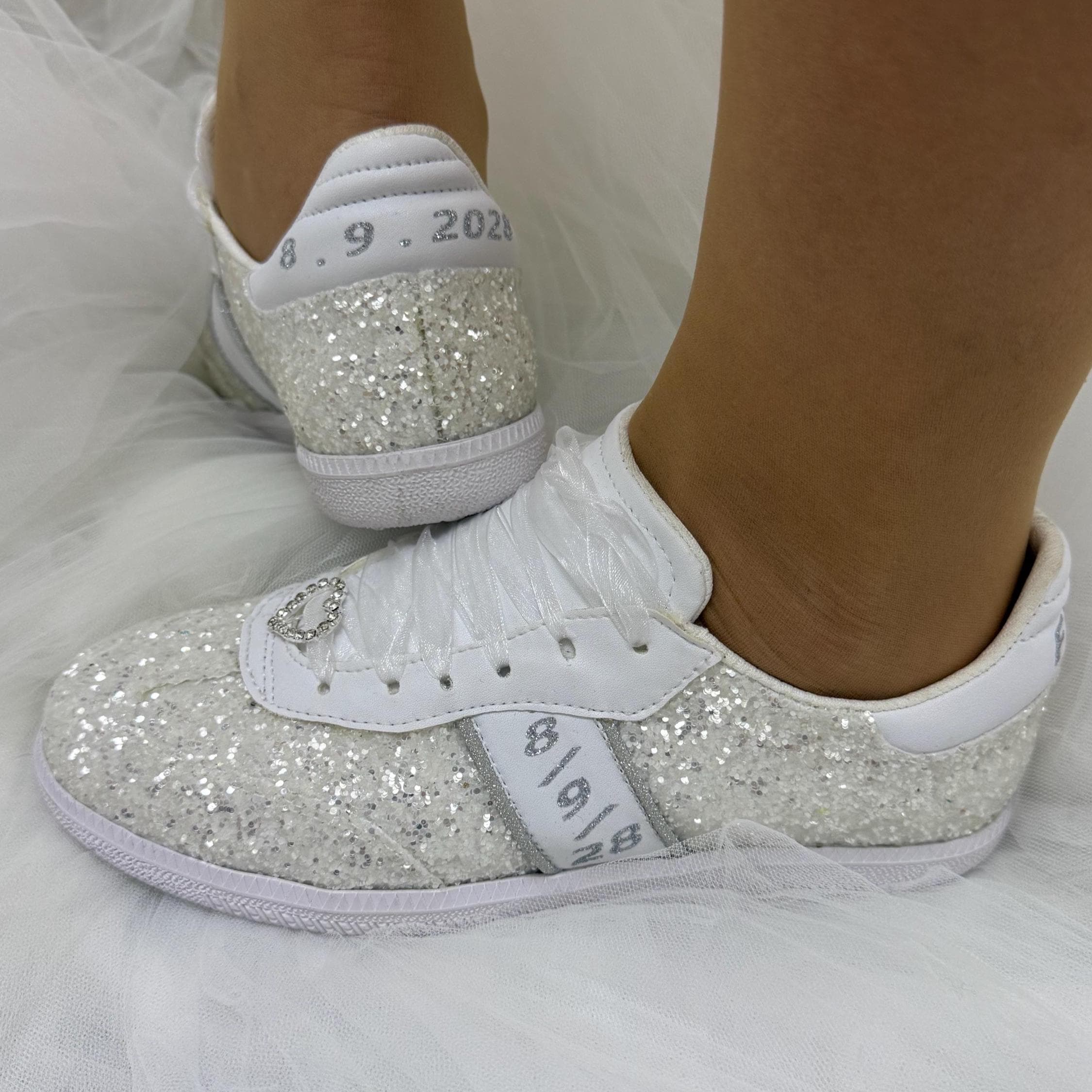At StiloShoes, we offer free customization for your shoes, including the addition of your name and date. We do not dye shoes in colors other than white; instead, we produce them using colored materials with original inventory colors. Our handcrafted shoes feature special touches, such as glitter and printed writing on some styles, while others incorporate these customizations onto the shoe laces. All customizations are free; simply add your preferences in the personalization section. The jewelry letters and numbers can be easily removed from the shoes. For any personalizations or changes to your order, we are eager to assist and design together with you. We kindly ask that you read the product description before placing your order.