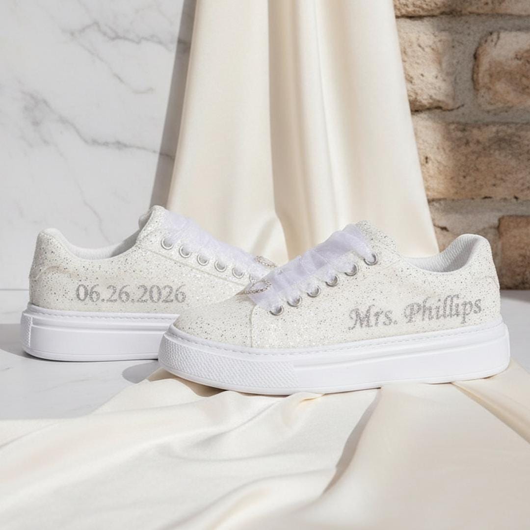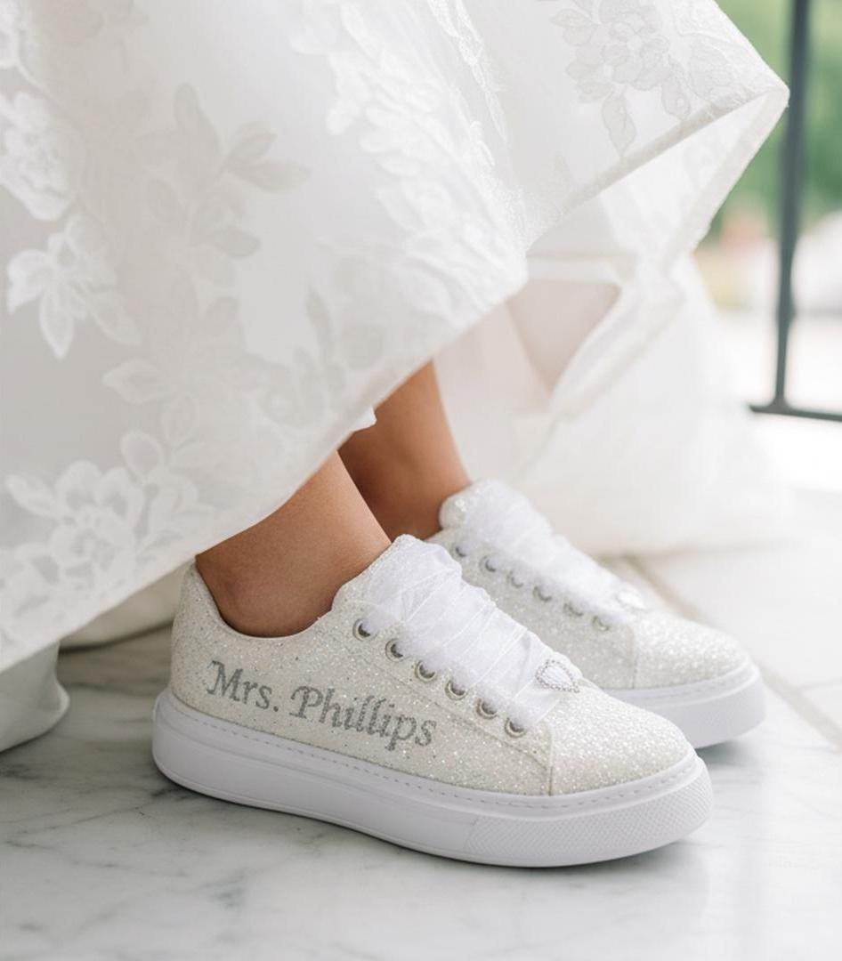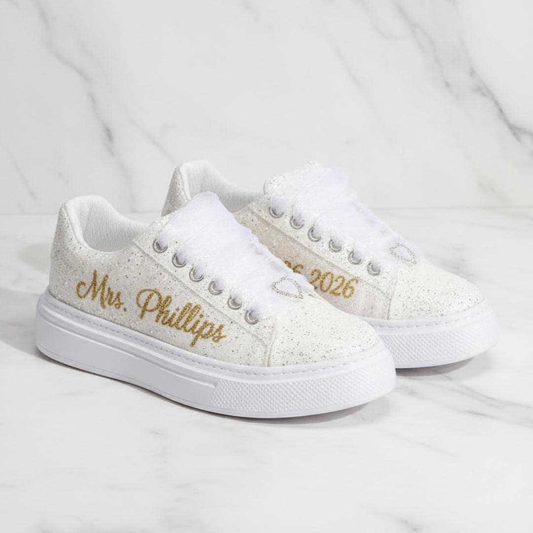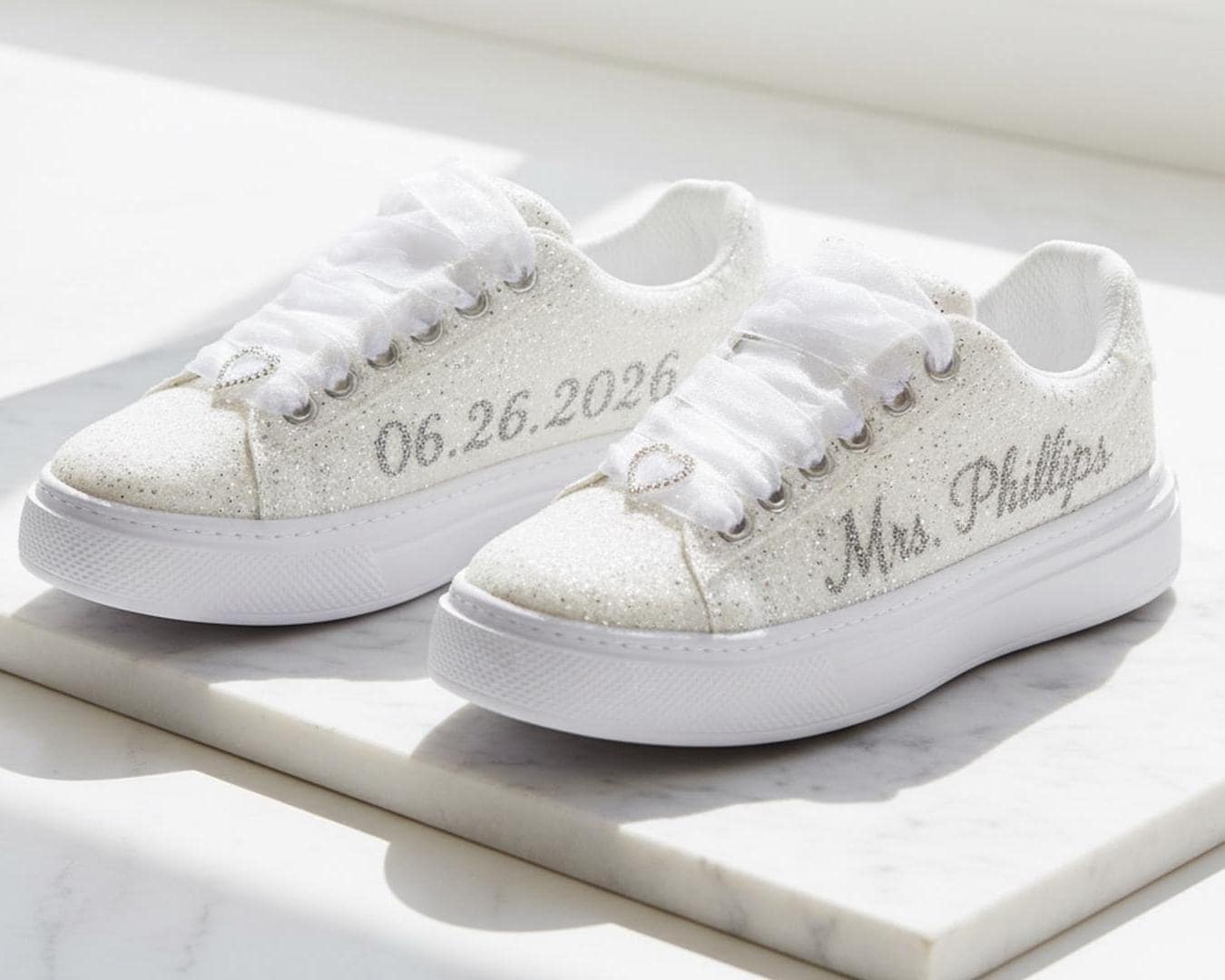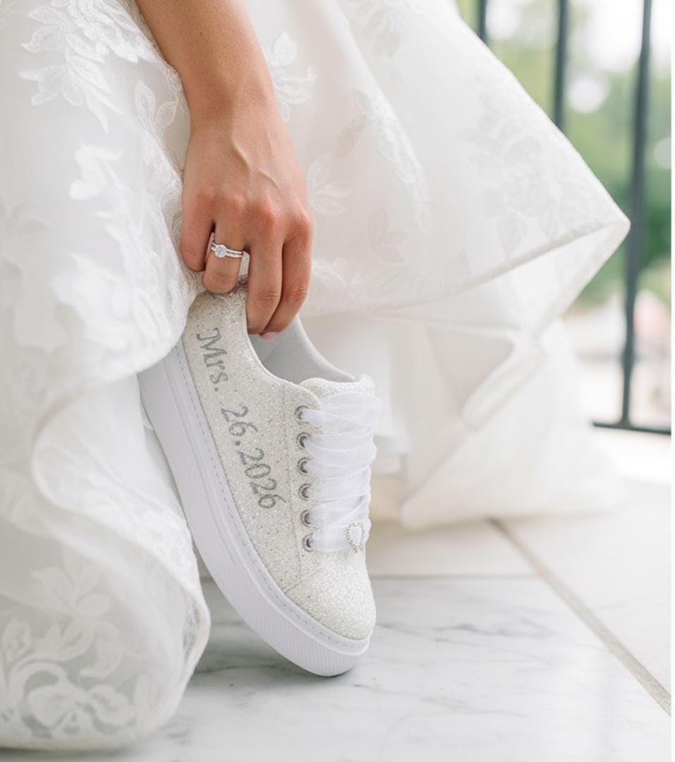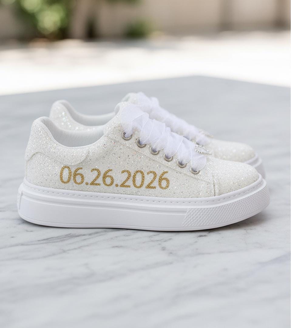 At StiloShoes, we offer free customization for your shoes, including the addition of your name and date. We do not dye shoes in colors other than white; instead, we produce them using colored materials with original inventory colors. Our handcrafted shoes feature special touches, such as glitter and printed writing on some styles, while others incorporate these customizations onto the shoe laces. All customizations are free; simply add your preferences in the personalization section. The jewelry letters and numbers can be easily removed from the shoes. For any personalizations or changes to your order, we are eager to assist and design together with you. We kindly ask that you read the product description before placing your order.
