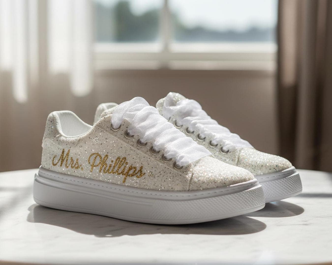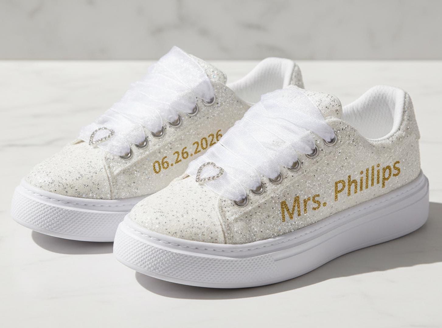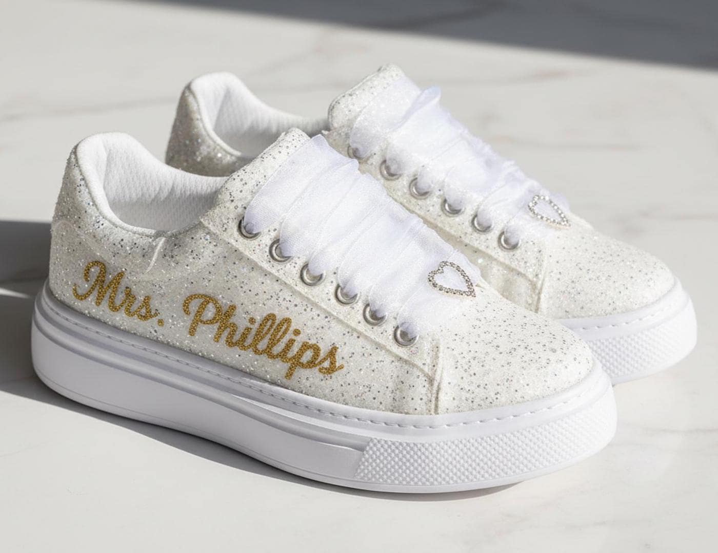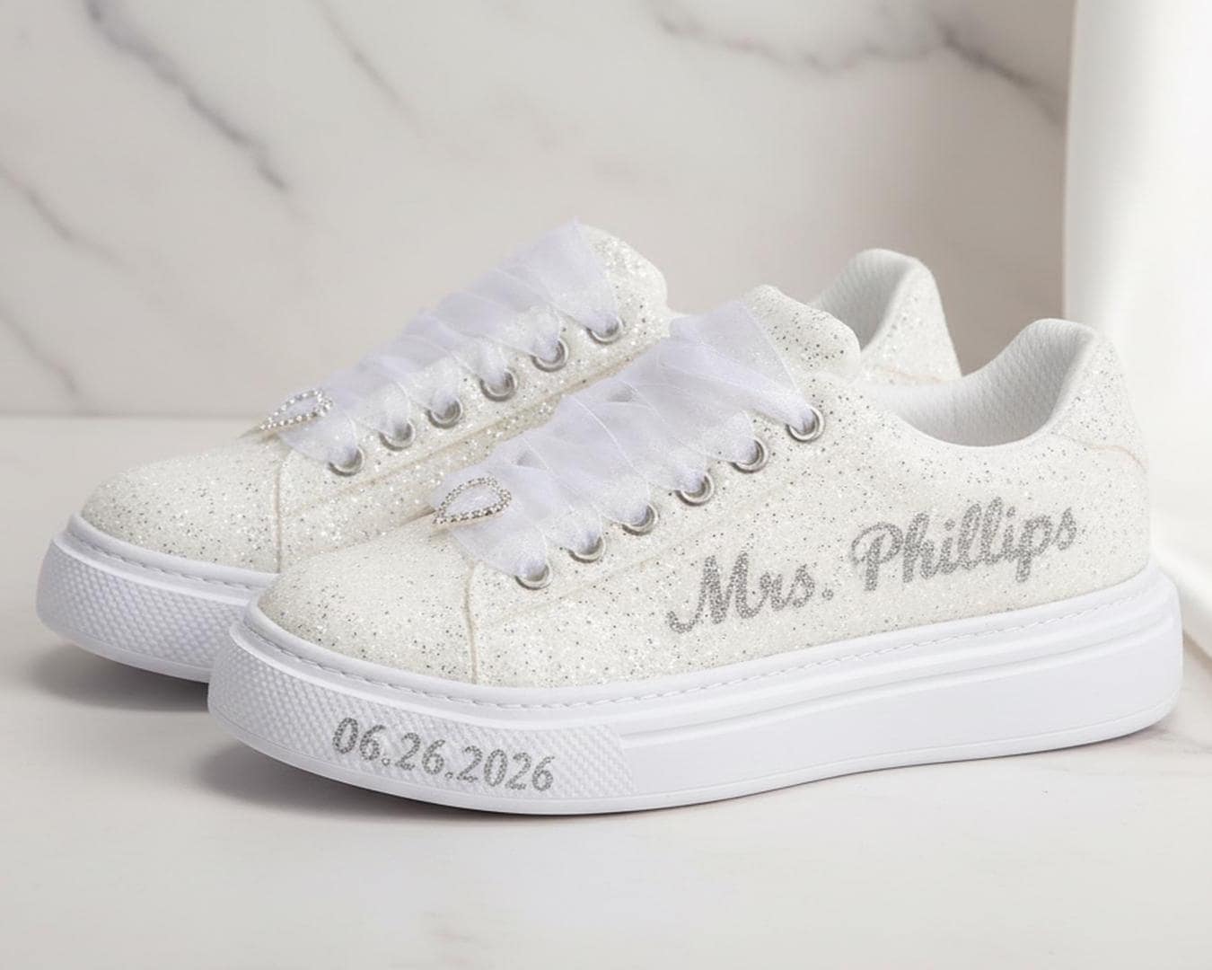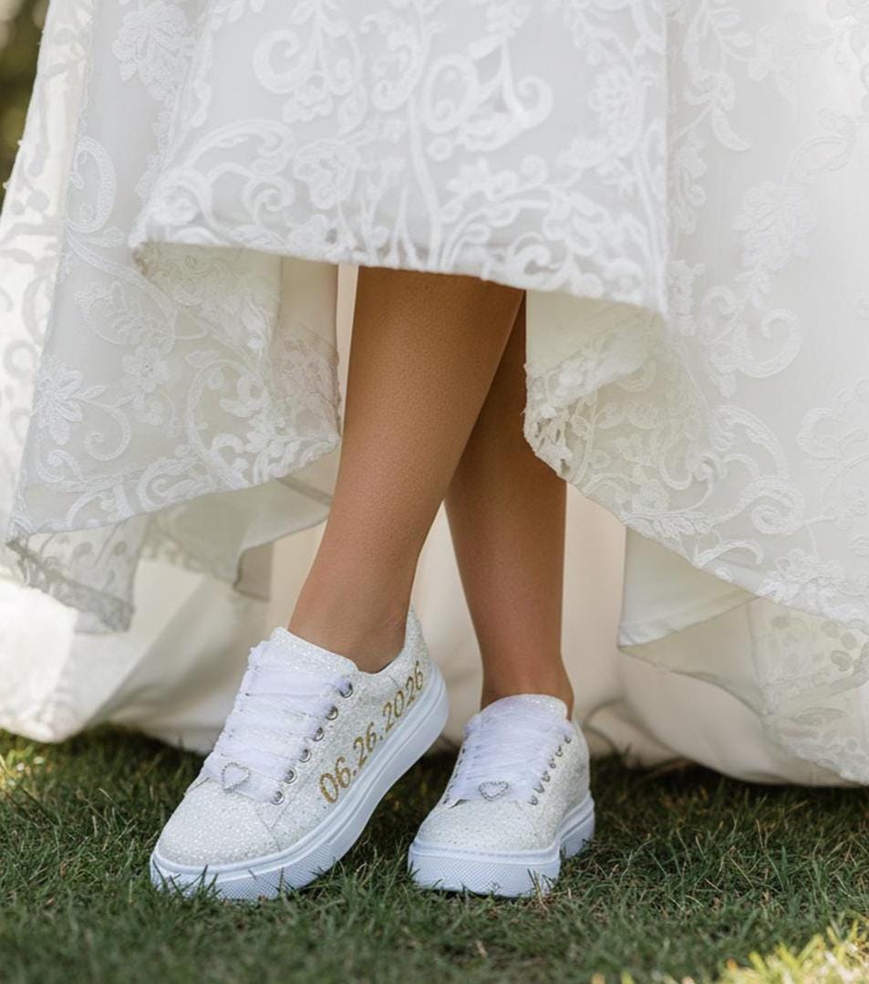 At StiloShoes, we offer free customization for your shoes, including the addition of your name and date. We do not dye shoes in colors other than white; instead, we produce them using colored materials with original inventory colors. Our handcrafted shoes feature special touches, such as glitter and printed writing on some styles, while others incorporate these customizations onto the shoe laces. All customizations are free; simply add your preferences in the personalization section. The jewelry letters and numbers can be easily removed from the shoes. For any personalizations or changes to your order, we are eager to assist and design together with you. We kindly ask that you read the product description before placing your order.