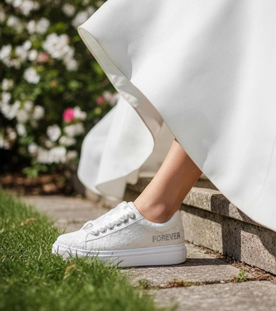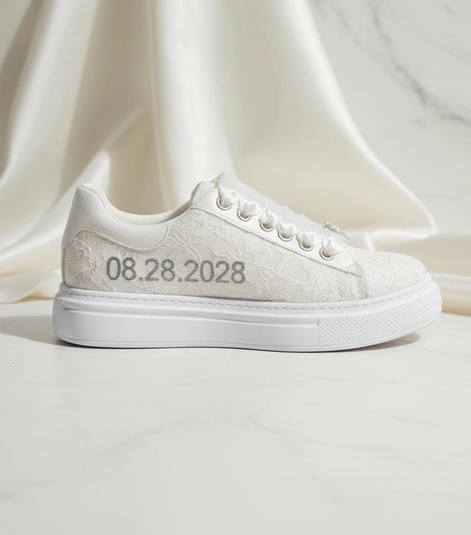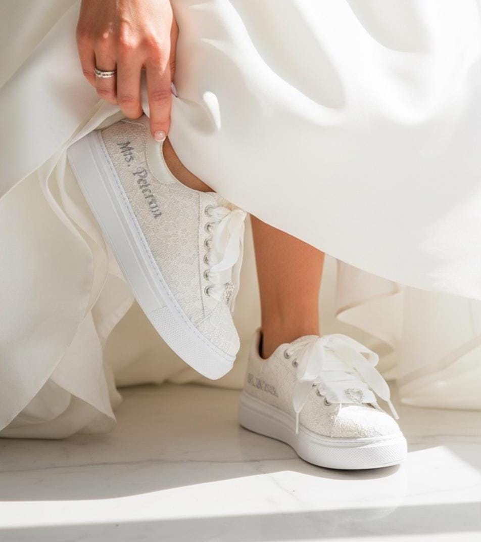 At StiloShoes, we offer free customization for your shoes, including the addition of your name and date. We do not dye shoes in colors other than white; instead, we produce them using colored materials with original inventory colors. Our handcrafted shoes feature special touches, such as glitter and printed writing on some styles, while others incorporate these customizations onto the shoe laces. All customizations are free; simply add your preferences in the personalization section. The jewelry letters and numbers can be easily removed from the shoes. For any personalizations or changes to your order, we are eager to assist and design together with you. We kindly ask that you read the product description before placing your order.