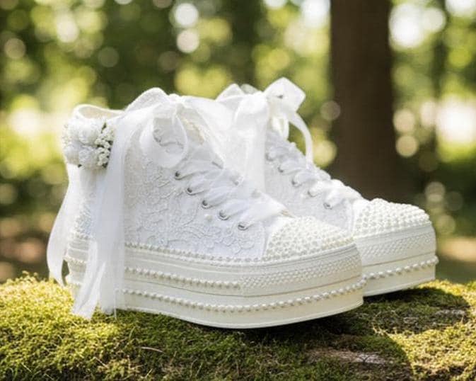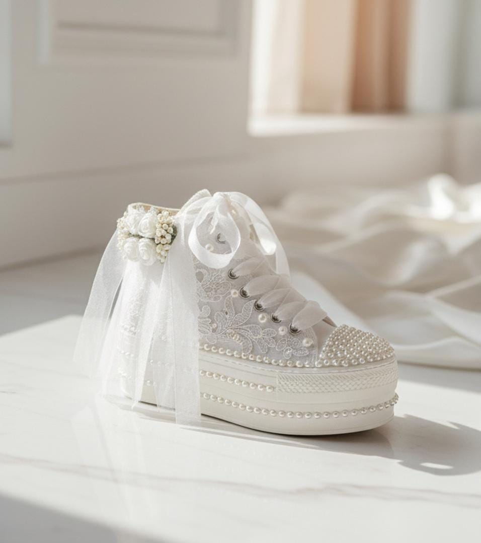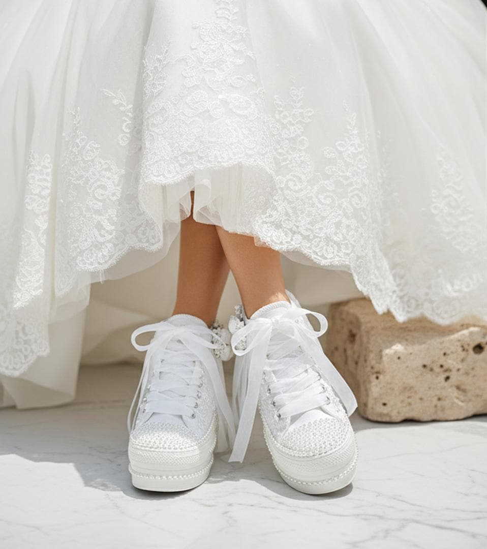 At StiloShoes, we offer free customization for your shoes, including the addition of your name and date. We do not dye shoes in colors other than white; instead, we produce them using colored materials with original inventory colors. Our handcrafted shoes feature special touches, such as glitter and printed writing on some styles, while others incorporate these customizations onto the shoe laces. All customizations are free; simply add your preferences in the personalization section. The jewelry letters and numbers can be easily removed from the shoes. For any personalizations or changes to your order, we are eager to assist and design together with you. We kindly ask that you read the product description before placing your order.