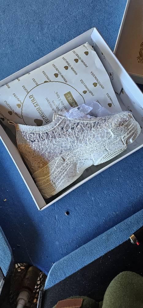 At StiloShoes, we offer free customization for your shoes, including the addition of your name and date. We do not dye shoes in colors other than white; instead, we produce them using colored materials with original inventory colors. Our handcrafted shoes feature special touches, such as glitter and printed writing on some styles, while others incorporate these customizations onto the shoe laces. All customizations are free; simply add your preferences in the personalization section. The jewelry letters and numbers can be easily removed from the shoes. For any personalizations or changes to your order, we are eager to assist and design together with you. We kindly ask that you read the product description before placing your order.